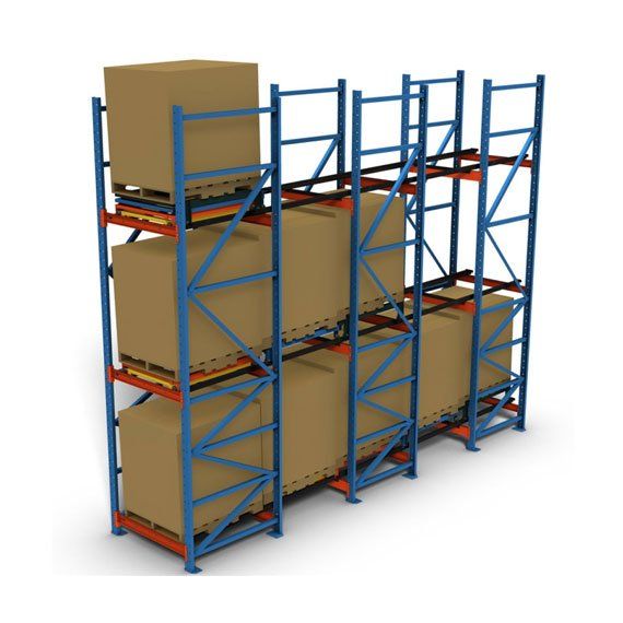 Los pallets se colocan en carriles de almacenamientos y ruedan hacia adelante en pendiente bajo la fuerza de la gravedad,la velocidad de los pallets por el carril está controlada por una serie de rodillos de freno.
